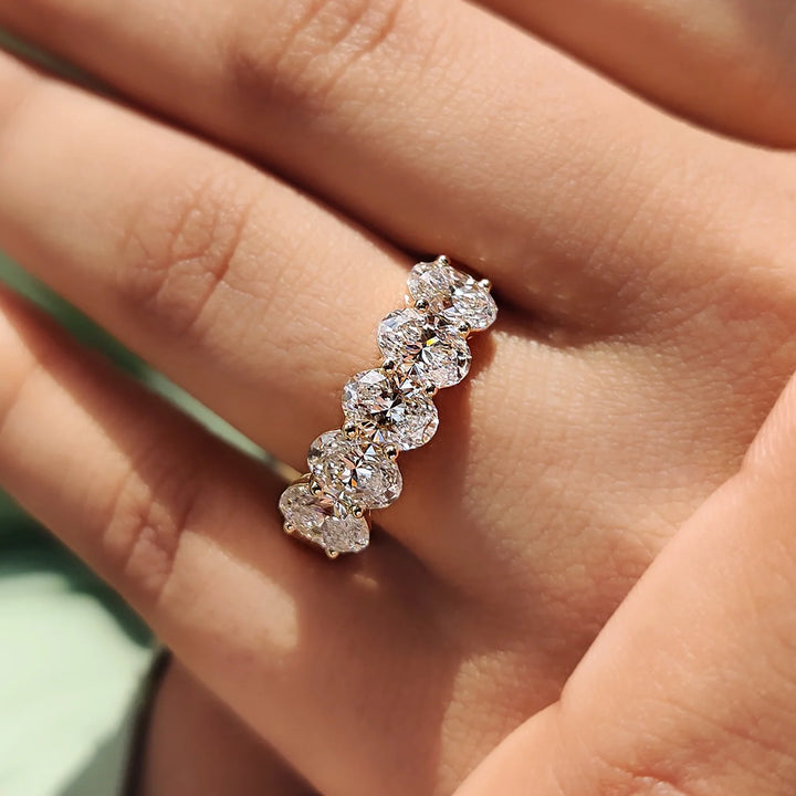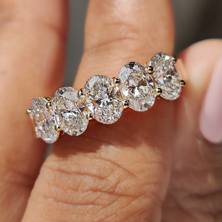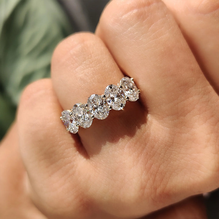 Introducing the exquisite five stone ring, a captivating piece of jewelry that will leave you breathless. This stunning ring features five brilliant oval-cut natural diamonds, meticulously arranged in a classic design that exudes elegance and sophistication.