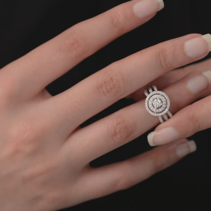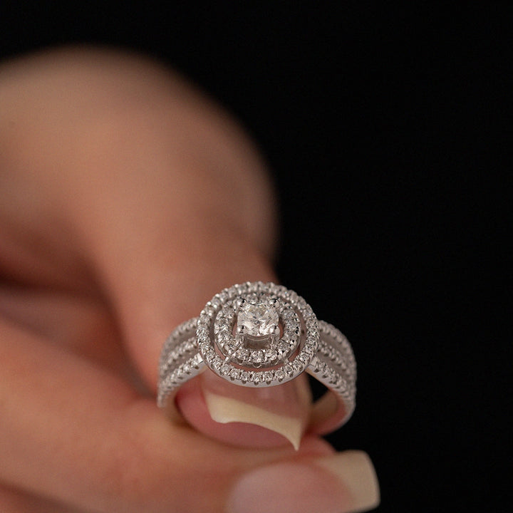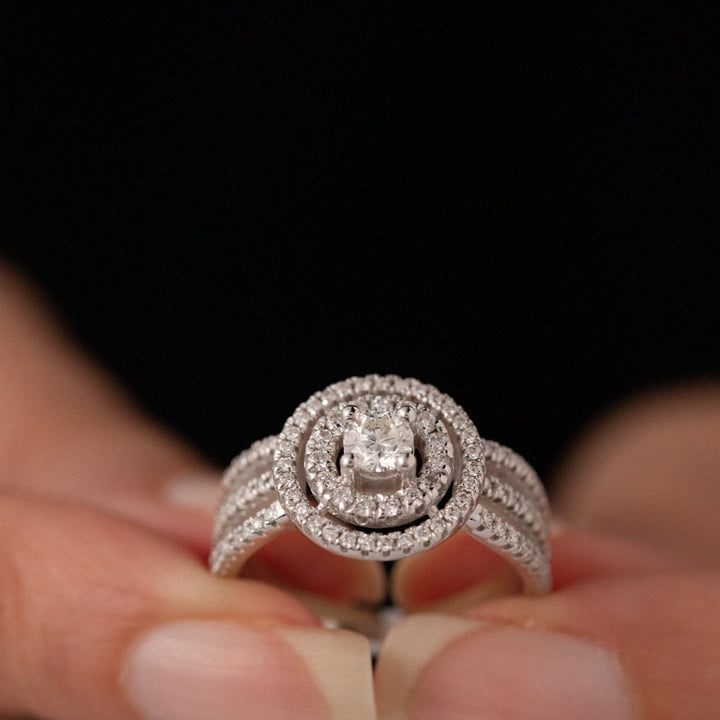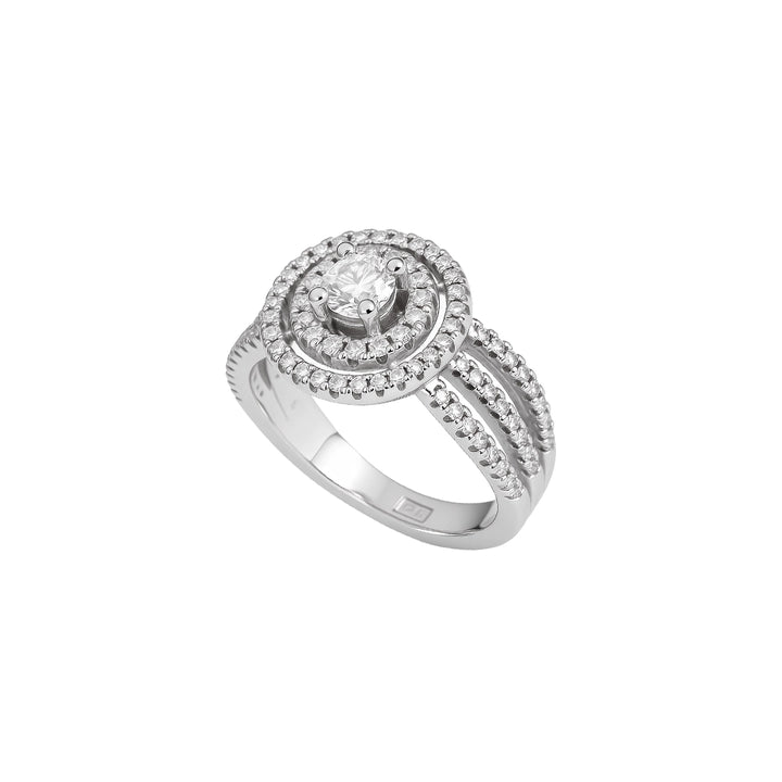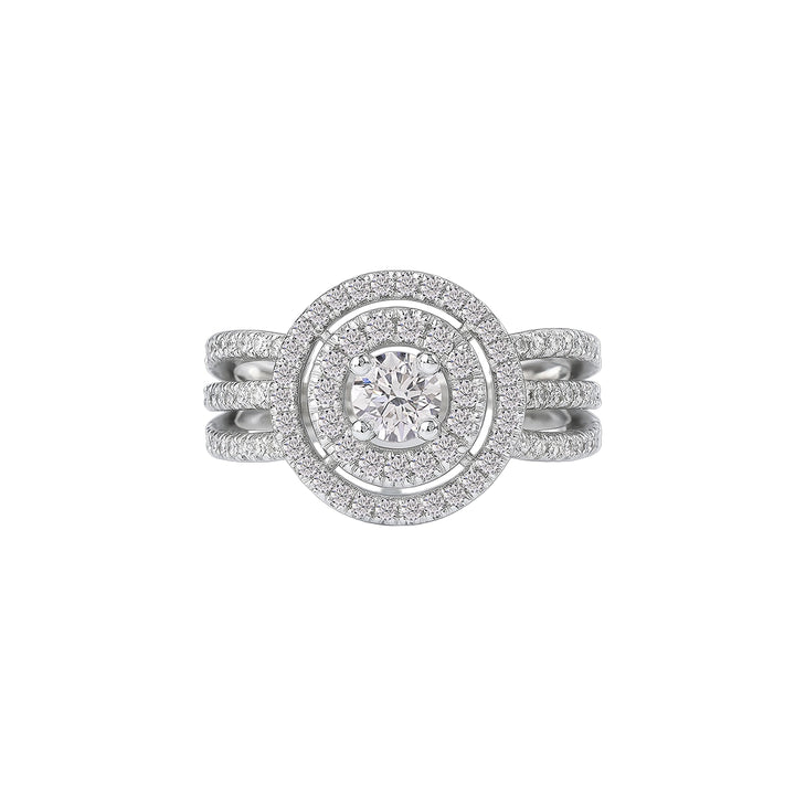 This magnificent ring is crafted in 18K white gold and adorned with a total of 0.90ct natural diamonds. The design is complemented by a split shank divided into three rows, each set with brilliant white diamonds which adds depth and dimension to the ring, creating a mesmerizing display of brilliance and beauty.