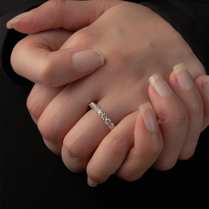 This signature diamond eternity band is made in White Gold. The diamonds weigh 0.10 carats each and are secured in U-shaped woven prongs. The diamonds are graded H in color and VS1 clarity. Notice the artistry displayed in the profile view. Hand-crafted for each finger it graces.